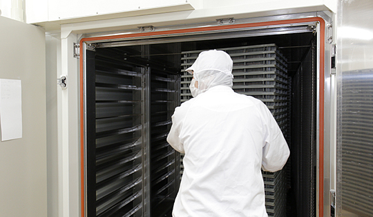 乾燥後、再び目視検査をします。さらに、検査機で金属の混入をチェック。