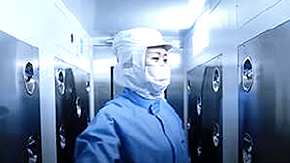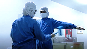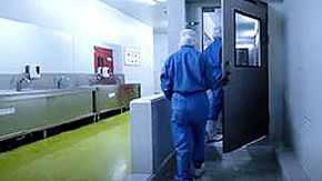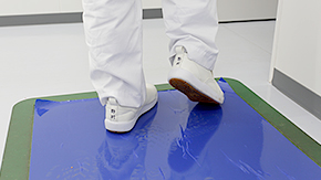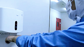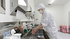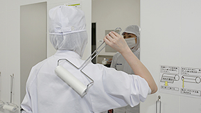 製造エリア入室前は、厳重な衛生対策を行います。製造エリアは清潔第一。入室前には、雑菌やホコリなどを完全に除去するために、手洗いやエアシャワー、ローラーがけなどを徹底して行っています。