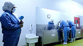 製造ラインはワンウェイ(一方通行)を採用しています。「原材料のそばに完成品を置く」「生肉に触れた後、加熱後の製品に触れる」といった行為が、菌を繁殖させる原因になります。