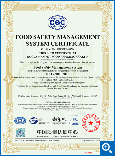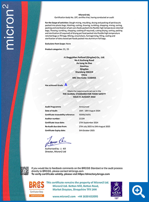 〈取得:ISO 9001(JISQ 9001)、ISO 22000、BRC規格〉ISOなどの国際規格は、製品自体の品質だけでなく設備や体制がしっかり整っていないと承認されません。ドギーマンでは、